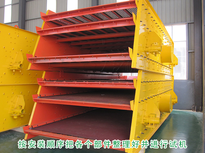 安裝開始時把基礎找平,接著按照支承或吊掛裝置,圓形振動篩的安裝圖,按順序把各個部件整理好,彈簧的裝入可按標記的試機進行選配。