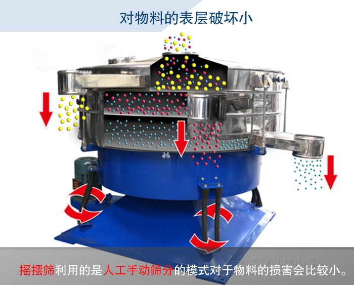 振動(dòng)篩的篩分是由振動(dòng)原理進(jìn)行篩分的,所以會(huì)對(duì)于物料的表層造成一定的損壞,而搖擺篩利用的是人工手動(dòng)篩分的模式對(duì)于物料的損害會(huì)比較小。