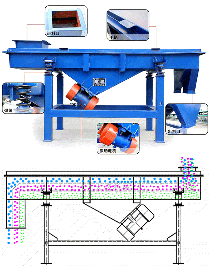 直排篩的原理是通過振動源的作用使物料在篩面做三維運動,這種運動方式可以使結(jié)塊物料散開,快速的通過篩網(wǎng)。精細物料直接由下部排出,雜物粗料則通過排渣出料口排出。