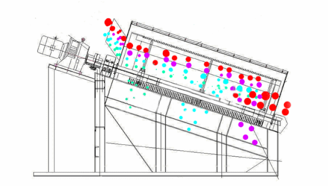 電機(jī)通過三角帶使激振器的偏心塊高速旋轉(zhuǎn),運(yùn)行的偏心塊產(chǎn)生很大的離心力,刺激篩箱產(chǎn)生一定幅度的圓周運(yùn)動(dòng),篩上的物料在傾斜的篩面上受到篩箱傳遞的沖量,產(chǎn)生連續(xù)的拋擲運(yùn)動(dòng),物料與篩面相遇的過程使小于篩孔的顆粒通過篩網(wǎng),從而實(shí)現(xiàn)分級。