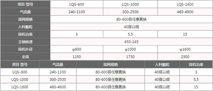 該機適合80-530目有網(wǎng)各種粉狀物料篩選分級,其篩分效率高、產(chǎn)量大、自動進料排料、連續(xù)作業(yè)、無污染,使以往用各種振動篩難以進行高細度精密篩分作業(yè)成為易事。經(jīng)過對120-180目輕鈣、300目重鈣、400目活性鈣、300目山楂粉、320-500目鋅粉、500目氧化鐵黑、氧化鐵紅、120-160目中藥粉、180-270目石英粉等物料的篩分使用,測得每平方米篩網(wǎng)面積每小時產(chǎn)量均在一噸左右,同時測得篩分效率在95%以上,空氣含塵量低于10mg/m3。