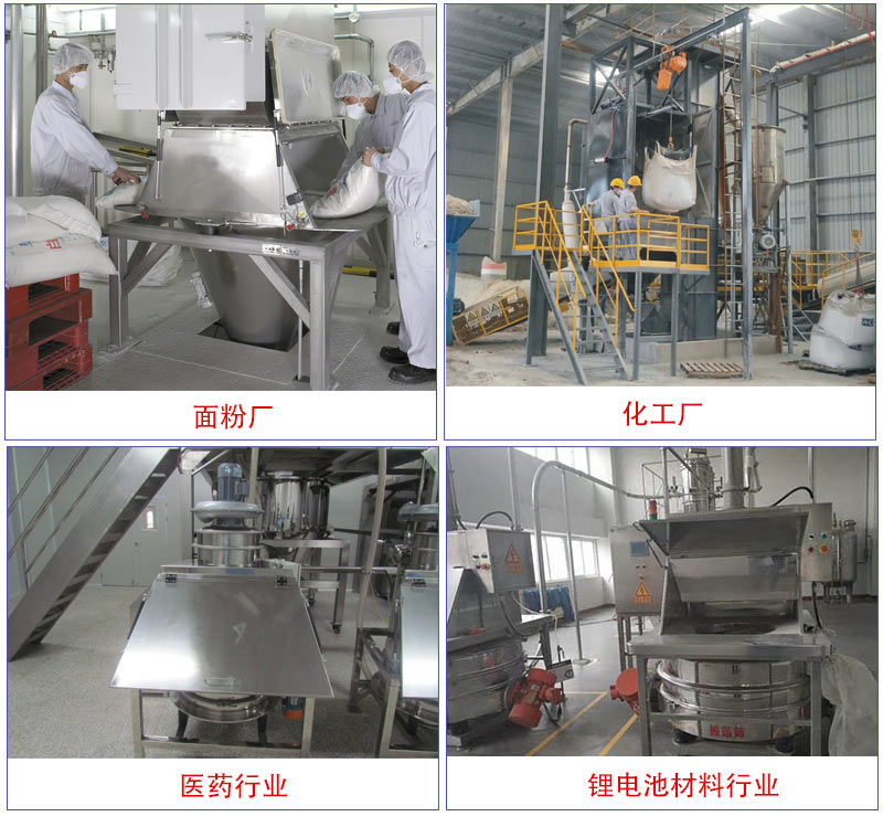 適用:食品、制藥、化工、冶金行業(yè)中小袋物料的拆包、投放、篩分和卸料,特別適用于粉料人工投料和預篩分。